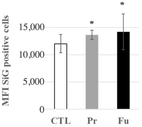 Fluorescent green silica (SiG) internalization of J774A.1 cells after a 10-day exposure to silica. Cells were exposed for 24 h to SiG (days 9 to 10). CTL: control, cells without nanomaterials, Pr: precipitated silica 220 m2/g, Fu: fumed silica 200 m2/g. Statistical significance in a Student t-test: * p < 0.05.