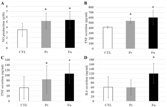 Inflammatory responses of J774A.1 cells after a 10-day exposure to silica, stimulated or not with LPS. (A) NO production without LPS, (B) TNFα secretion without LPS, (C) TNFα secretion with LPS, (D) IL-6 secretion with LPS. CTL: control, cells without nanomaterials, Pr: precipitated silica 220 m2/g, Fu: fumed silica 200 m2/g. Statistical significance in a Student t-test: * p < 0.05.