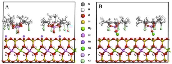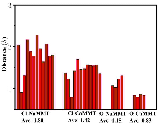 The distances between the main TCPP atoms (chlorine atoms and P=O) and the surfaces of the MMT were analyzed, as shown in Figure 3. In the system of TCPP and CaMMT, the average vertical distance between the chlorine atom and the plane where the Ca atom was located is 1.42 Å, and the average vertical distance between the O atom and the plane is 0.83 Å. In the system of TCPP and NaMMT, the average vertical distance between the chlorine atom and the plane where the Na atom is located is 1.80 Å, and the average vertical distance between the O atom and the plane is 1.15 Å, both of which are larger than CaMMT. The main reason for this phenomenon is that the binding energy of calcium ion and TCPP is greater than that of the Na ion and TCPP. Ca ion has a stronger interaction with TCPP, which could adsorb TCPP closer to MMT. Close range annotation between molecules in the model is shown in Figure 4.