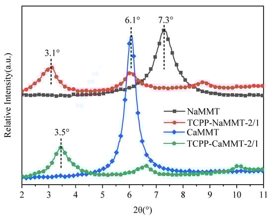 In order to verify the simulation results, TCPP-NaMMT-2/1 and TCPP-CaMMT-2/1 were prepared by the direct mixing method. The TCPP-NaMMT-2/1 and TCPP-CaMMT-2/1 were characterized by XRD, as shown in Figure 5.