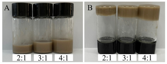 The TCPP-CaMMT nanocompoud in different proportions were prepared after verifying that TCPP and CaMMT could obtain organic intercalated TCPP-CaMMT, and the gelation phenomenon of TCPP-CaMMT nanocompoud was analyzed. For the TCPP and CaMMT of the mass ratios 1:2 and 1:1, because of the small proportion of TCPP, CaMMT could not be fully contacted, and the mixture behaved as a sticky powder. For the TCPP and CaMMT of the mass ratios 2:1 and 4:1, the TCPP-CaMMT showed gelation and eventually formed a stable brown gelatinous complex, as shown in Figure 6. Because of that, when TCPP entered the layer spacing of MMT, the MMT layer spacing was enlarged. Under the action of TCPP solvation and stirring force, the montmorillonite crystal layer could be exfoliated and spontaneously dispersed to form a gel. For the sample TCPP to CaMMT as 5:1, the lower layer is viscous, and the upper layer is redundant TCPP liquid.