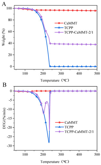 TGA results of TCPP-CaMMT-2/1 and TCPP in N2 are shown in Table 4 and Figure 9. The thermal weight loss of TCPP starts at about 160 °C and ends at about 240 °C, and the temperature at the maximum weight loss rate, Tmax, is 233.0 °C. Compared with the rapid weight loss of TCPP in one stage, the thermal weight loss process of TCPP-CaMMT-2/1 nanocompounds could be divided into two stages; the Tmax1 and Tmax2 are 202.9 °C and 235.9 °C, respectively. The first stage is the weight loss of the free TCPP, and the second stage is the weight loss from TCPP intercalating into montmorillonite layers due to the strong interaction with montmorillonite and the thermal shielding of montmorillonite layers.