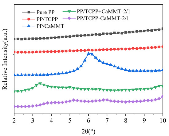 The microstructures of montmorillonite in the PP matrix were investigated by XRD patterns, as shown in Figure 10. The characteristic peak of PP/CaMMT is at 6.1°, which is similar to that of natural CaMMT (d001= 1.4 nm), indicating that CaMMT still exists in a layered structure in the PP composites. The characteristic peak of PP/TCPP + CaMMT-2/1 appeared at 3.4°, indicating that the layer space of the montmorillonite had been increased in the PP/TCPP + CaMMT-2/1. This is because TCPP and CaMMT were in contact in the processing of PP composite, and the partial intercalation occurred between TCPP and CaMMT. However, the characteristic peaks of CaMMT, such as 3.4° and 6.1°, are not obvious in the XRD patterns of PP/TCPP-CaMMT-2/1, indicating that CaMMT exists in an exfoliated or amorphous state in the PP composite under the action of twin-screw shear force. The results show that the TCPP-CaMMT-2/1 sample had better dispersion in PP than the TCPP + CaMMT-2/1.