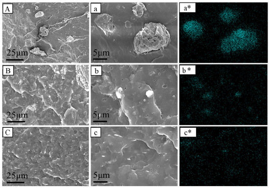 SEM diagram of PP composites. (A,a) PP/CaMMT; (B,b) PP/TCPP + CaMMT-2/1; (C,c) PP/TCPP-CaMMT-2/1; (a*–c*) Si distribution mapping.