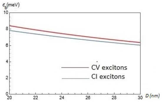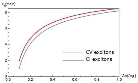 In Figure 4, we present the results of our calculations for the exciton binding energy for CV and CI excitons as functions of the interlayer separation D for chosen parameter and gap . According to Figure 4, is a decreasing function of D, whereas for CV excitons the exciton binding energy is slightly larger than for CI excitons.