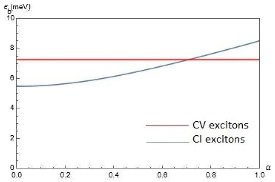 In Figure 3, we present our results for the exciton binding energy for CV and CI excitons as functions of the parameter for chosen gap and interlayer separations . According to Figure 3, does not depend on for CV excitons, whereas it is an increasing function of for CI excitons. At for CV excitons is larger than for CI excitons, while at for CI excitons is larger than for CV excitons.