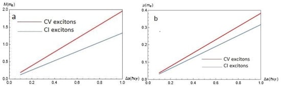 In Figure 5, we present plots of the effective masses for CV and CI dipolar excitons as functions of the gap for chosen for (a) center-of-mass exciton mass M on the left-hand side and (b) reduced exciton mass , on the right. According to Figure 5, both M and for the CV and CI excitons are increasing functions of , while for CV excitons both M and are slightly larger than for CI excitons.