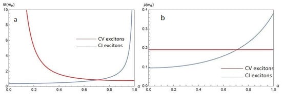 Figure 6 shows the effective masses of a dipolar exciton for CV and CI excitons as functions of for chosen for (a) center-of-mass exciton mass M in the left panel and (b) reduced exciton mass , on the right. According to Figure 6, for CV excitons M is a decreasing function of , whereas does not depend on . For CI excitons, both M and increase as is increased. For , both M and for CV excitons are larger than for CI excitons, but when both M and for CV excitons are smaller than for CI excitons.