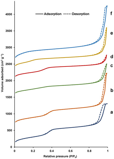 N2 adsorption–desorption isotherms of the synthesized materials: (a) Fe100-UVM-7-C16, (b) Fe50-UVM-7-C16, (c) Fe25-UVM-7-C16, (d) Fe10-UVM-7-C16, (e) Fe50-UVM-7-C12, and (f) Fe50-UVM-7-C10.
