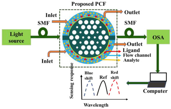 where, εAU denotes the permittivity of gold, ε∞ = 5.9673 is the permittivity at high frequency, angular frequency is denoted by ω, ωD is the plasma frequency, γD is the damping frequency, where ω = 2πc/λ, ωD = 4227.2π THz, γD = 31.84π THz and weighting factor Δε = 1.09. The spectral width ΓL = 209.72π THz and oscillator strength ΩL =1300.14π THz, respectively. Figure 2 shows the typical set-up for the sensing process of the proposed sensor. Firstly, the incident light was launched from the optical tunable source. By passing through the polarizer and polarizer controller, it turned into a linearly polarized light. The linearly polarized light was introduced into the proposed sensor via the single-mode fiber (SMF) as the sensor is small. The coupling between the SMF and the proposed sensor was obtained by splicing techniques. The inlets and outlets of the analyte samples were maintained by a continuous pump. When the analyte sample and ligands interacted with each other, the effective refractive index changed, and the wavelength shifted either in shorter wavelengths or the longer wavelengths. An optical spectrum analyzer (OSA) measured the transmitted power that is connected to the sensor via another SMF. Finally, the output was measured by the computer connected to the OSA. In the wavelength interrogation method, the performance is measured by observing the resonance wavelength shift. However, in intensity-based analysis, the sensitivity is measured with the change of resonance intensity [19].