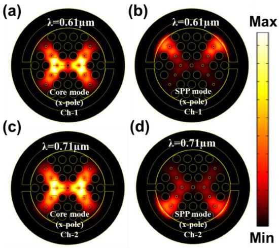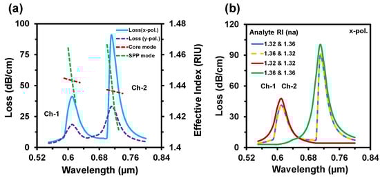 The guided evanescent field which is generated during the penetration of core light is the fundamental requirement of the SPR phenomenon. A surface plasmon wave (SPW) is generated when the evanescent field excites the electrons in the metal layer by hitting [18]. Resonance occurs when the frequency of free electrons and the incident photons are identical. At this condition, maximum energy transfers from the core guided mode to the SPP mode. SPW is very sensible to the surrounding medium RI (SRI). It can detect any slight change of SRI and the resonance peak shifts with this change. Thus, it can detect any unknown analyte. Figure 3a–d represent the electric field distribution of the core guided mode and the SPP mode for Ch-1 and Ch-2 respectively. Figure 4a depicts the dispersion relationship of the core-guided mode, surface plasmon polariton (SPP) mode, and the confinement loss as a function of wavelength for dielectric RI 1.32 and 1.36 at Ch-1 and Ch-2, respectively. Phase matching occurred at 0.61 µm and at 0.71 µm for two channels separately. At these points, the real effective part of both modes (core-guided mode and SPP mode) intersected with each other. Maximum confinement loss (CL) appeared at this point. According to Figure 4a, the x-polarized mode provided a sharper resonance peak than the y-polarized mode. So, the x-polarized mode was considered for the entire analysis. CL plays a critical role to evaluate other sensing performances, which is calculated from the following equation [30]: