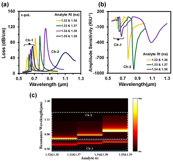 where, α(λ, na) denotes the CL and δα(λ, na) is the loss difference between two consecutive analyte RIs. Figure 5b illustrates the AS spectra of the proposed sensor when the sample RI varied simultaneously in two channels. The maximum AS of Ch-1 was 287 RIU−1 and 928 RIU−1 for Ch-2, respectively. The normalized 2D map of the CL intensity is visualized in Figure 5c. The coupling intensity increased when the analyte RI increased. Double coupling happened at the same time due to the simultaneous changing of two analyte RIs. In Figure 5c, the lower part presents the coupling intensity of Ch-1 and the upper part for Ch-2. SR is a crucial parameter as it defines the detection capability of any small changes of the dielectric RI. The SR is obtained from [5]: