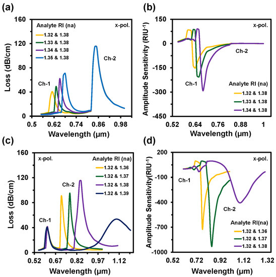 So, the reported sensor could sense the minimal change up to 10−6 order. The obtained LOD was 1.11 × 10−8 RIU2/nm and 1.6 × 10−10 RIU2/nm for Ch-1 and Ch-2, respectively. The LOD can be executed by the division of maximum resolution and the sensitivity (R/Sλ) [46]. Figure 6a,b shows the CL spectra and the AS when the analyte RI varied from 1.32 to 1.35 at Ch-1 and RI 1.38 was fixed at Ch-2. At Ch-1, with the increase of analyte RI, the RW shifted towards the longer wavelength. The resonance peak displayed at 0.61 µm, 0.63 µm, 0.65 µm, and 0.68 µm for Ch-1 but the resonance peak stayed fixed at 0.85 µm for Ch-2 as RI was set at 1.38. The maximum WS of 3000 nm/RIU was obtained for Ch-1. Similarly, Figure 6c–d represents the spectrum of CL and AS when the Ch-2 altered from 1.36 to 1.39 and Ch-1 stayed at RI 1.32. The resonance peak appeared at 0.71 µm, 0.77 µm, 0.85 µm, and 1.10 µm for the analyte RIs of 1.36, 1.37, 1.38, and 1.39, respectively. The acquired WSs were 6000 nm/RIU, 8000 nm/RIU, and 25,000 nm/RIU and the ASs were 712 RIU−1, 931 RIU−1, and 400 RIU−1 for RI of 1.36, 1.37, and 1.38 in Ch-2, respectively, but no change was observed in Ch-1 as RI was fixed at RI 1.32.
