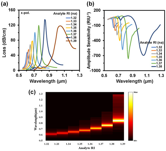 The polynomial fitting was obtained as R2 = 0.9932. The value of R2 was very close to unity, which means that the sensor is highly sensitive. The sensor performances are summarized in detail in Table 1. Additionally, we show the relation between the analyte RI and propagation loss at the resonant wavelength in Figure 8b. This relation helps to corelate the coupling strength as a function of analyte RI. Moreover, if the loss is very high, then the practical realization of that sensor is not possible as the input signal will disappear immediately and will not be able to produce a measurable signal at the output side [12,47].