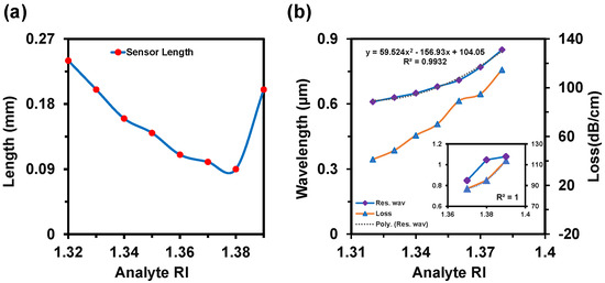 (a) Sensor length and (b) resonance wavelength shift and loss curve fitting of the proposed sensor as a function of analyte RI from 1.32 to 1.39.