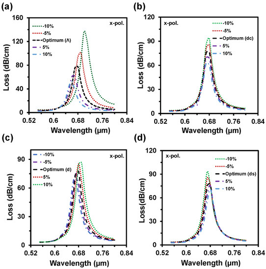 By considering the performance, we choose 40 nm as an optimal value. Figure 10a depicts the impacts of pitch value variations on CL. Here, the loss depth increased with the decrement of pitch value and the RW shifted from 0.68 µm to 0.69 µm and 0.7 µm with these changes. On the contrary, loss depth reduced to 61 dB/cm and 53 dB/cm when the pitch value increased by 5% to 10% from neutral. Moreover, The RW fluctuated 0.68 µm to 0.67 µm and 0.66 µm with this increment of the pitch value. Similarly, loss depth increased with the scaling down of the center air-hole diameter or vice-versa (from Figure 10b). Though the loss peak fluctuated, there was no significant change in RW. So, the WS remained the same. With the enlargement of the regular air-hole diameter, the effective index of core-guided mode decreased, resulting in the loss peak rising and redshift occurrence in RW. On the other hand, loss depth decreased with the scaling down of d and the RW faced the blue shift. All these are evident from Figure 10c. Small air-hole diameter has a strong influence in phase matching.