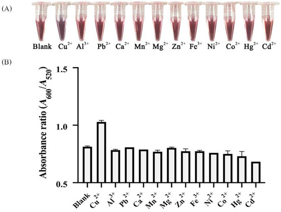 - Zhao, W.; Jia, W.; Sun, M.; Liu, X.; Zhang, Q.; Zong, C.; Qu, J.; Gai, H. Colorimetric detection of Cu2+ by surface coordination complexes of polyethyleneimine-capped Au nanoparticles. Sens. Actuators B Chem. 2016, 223, 411–416. [Google Scholar] [CrossRef]