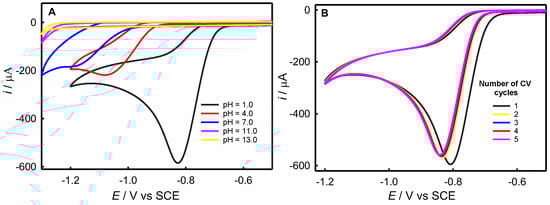 The AuNPs were prepared according to Ji et al. [32]. The UV-Vis absorption spectrum shows a surface plasmon resonance absorption peak of AuNPs at 521 nm, as shown in Figure S1. The electroreduction of cPy at different pH values was investigated by CV. As shown in Figure 1, 10 mM cPy showed irreversible electroreduction signals at pH 1.0, 3.0, 7.0, 11.0, and 13.0. With the increase in solution pH, the reduction peak shifted negatively and the intensity was weakened. Almost no reduction peak was found in the alkaline environment in the examined potential range. Hence, the electroreduction reaction of cPy was an electron transfer reaction coupled with proton transfer [33,34]. Finally, 0.1 M aqueous H2SO4 was selected to dissolve cPy for its electroreduction. As shown in Figure 1B, the irreversible reduction peak at ca. −0.8 V resulted from the reduction of cPy [35]. The electroreduction of cPy will reach saturation in a short time, forming a saturated thin layer structure. In the electrode preparation, the number of cPy-electroreduction cycles was selected to be 3.