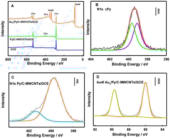 The modified materials and electrodes were characterized by XPS, as shown in Figure 2. After the N1s peaks of Py are separated, the peak positions of Py N and cyano N are at 399.0 eV and 399.8 eV, respectively. When the atoms in the ligand are coordinated or protonated, the density of the electron cloud decreases to a certain extent, which is reflected in the positive shift of the peak position in the XPS spectrum [36,37]. The N1s peak positions of Py and protonated N are at 399.9 eV and 401.9 eV, respectively, and both peaks have a certain degree of positive shift, indicating that the Py ligand was successfully modified on the C-MWCNTs/GCE. Obvious Au 4f peaks are found in Figure 2A,D, indicating that the Aus/Py/C-MWCNTs/GCE has been successfully prepared.