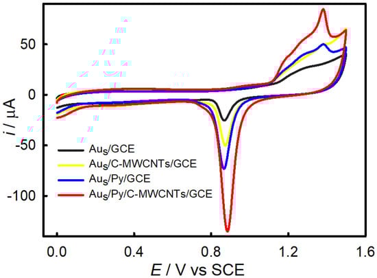 The Aus/Py/C-MWCNTs/GCE was characterized by CV in 0.1 M aqueous H2SO4, as shown in Figure 3. The anodic peaks of ca. 1.1 V and 1.5 V are assigned to the formation peaks of gold oxides (AuOx). The cathodic peaks of ca. 0 V and 0.9 V are assigned to the reduction peaks of H+ and AuOx, respectively. As shown in Figure S3, with the increase in the gold-staining time, the current intensity of the reduction peak of AuOx increased significantly, and the increase slowed down after the time exceeded 5 min. Therefore, the gold-staining time of 5 min was used in the subsequent experiments. The real surface area of Au (SAu) is positively correlated with the charge of the reduction peak of AuOx () [38] and can be estimated using a conversion factor of 390 μC cm−2. The ratio of SAu to the geometrical area of the electrode (0.0707 cm2) gives the roughness factor (Rf). Next, the effect of the time of gold dyeing on the roughness Rf was investigated. Reduction peaks of AuOx were observed for Au/GCE, Aus/C-MWCNTs/GCE, Aus/Py/GCE, and Aus/Py/C-MWCNTs/GCE, but the heights of reduction peaks are obviously different. The of Aus/Py/C-MWCNTs/GCE is 58.2 μC, corresponding to SAu = 0.149 cm−2 and Rf = 2.12, which are significantly higher than those of Au/GCE, Aus/C-MWCNTs/GCE, and Aus/Py/GCE, indicating that gold staining is a simple and effective method to increase Rf.