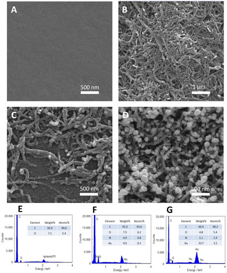 SEM images and EDX spectra of Py/GCE (A,E), Py/C-MWCNTs/GCE (B), AuNPs/Py/C-MWCNTs/GCE (C,F), and Aus/Py/C-MWCNTs/GCE (D,G).