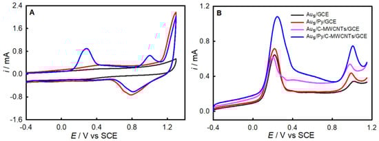 (A) CV curves on GCE (black) and Aus/Py/C-MWCNTs/GCE (blue) in 0.1 M aqueous H2SO4 containing 1.0 μM As(III) and on Aus/Py/C-MWCNTs/GCE in As(III)-free 0.1 M aqueous H2SO4 (red); (B) LSASV response on the Au-modified electrodes in 0.1 M aqueous H2SO4 containing 1.0 μM As(III). The experiments were conducted after preconcentration at −0.40 V for 7 min. Scan rate: 5 V s−1.