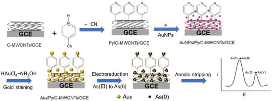 Herein, we report the preparation of a Au-stained Au nanoparticle (Aus)/pyridine (Py)/carboxylated multiwalled carbon nanotubes (C-MWCNTs)/glassy carbon electrode (GCE) by cast-coating of C-MWCNTs on a GCE, electroreduction of 4-cyanopyridine (cPy) to Py, adsorption of gold nanoparticles (AuNPs), and gold staining. The use of 4-cyanopyridine (Py) can lead to the cleavage of the C-C bond between the pyridyl and the cyano group when the 4-cyanopyridine undergoes electroreduction on the electrode, resulting in a pyridine radical. The pyridine radicals are highly active and can be covalently bound well onto the surface of C-MWCNTs/GCE to form Py/C-MWCNTs/GCE. The Py/C-MWCNTs/GCE can provide a good substrate for AuNPs loading and gold staining to increase the Au surface area. Under optimized conditions, the Aus/Py/C-MWCNTs/GCE can be used for the ASV analysis of As(III), with high sensitivity, low detection limit, high selectivity, good stability, and reproducibility.