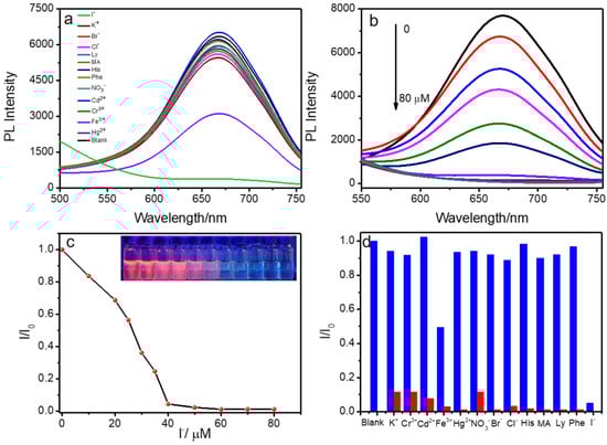 The PL variation (enhancement or quenching) of probe materials could be used for detecting certain substances. Iodine (I) is one of the essential trace elements, and plays an important role in maintaining normal functions in the body [37,38,39]. Monitoring the level of I− in the human body is considered an important part of maintaining human health. The detection of I− with high selectivity and sensitivity is of great significance for tracing its physiological functions in organisms. Thus, considering the luminescent property of CA/DPT-AuNCs nanofibers, whose detection of small molecules and metal ions was explored, the changes in the luminescent intensity were monitored. As shown in Figure 2a, with the addition of 40 μM metal ions and small molecules, most molecules (K+, Cr3+, Fe3+, Hg2+, Cd2+ NO3−, Br−, Cl−, His, MA, Ly and Phe) presented slight changes in emission, except for I−, suggesting that the CA/DPT-AuNCs possessed a sensitivity toward I−. We studied the concentration-dependent PL spectra of DPT-AuNCs with regard to CA. As shown in Figure 2b, the PL intensity of CA/DPT-AuNCs decreased gradually with increasing concentrations of I− (cI−). Moreover, the PL intensity and cI− showed a linear relation ranging from 0 to 40 μM (Figure 2c). The limit of detection (LOD) was calculated to be 2.75 μM based on signal-to-noise ratio (S/N) of 3, which was comparable to that of some previous reports [40,41,42]. Simultaneously, the association constant (K) that could evaluate the interaction of DPT-AuNCs and CA can be calculated according to the Benesie–Hildebrand equation as follows: