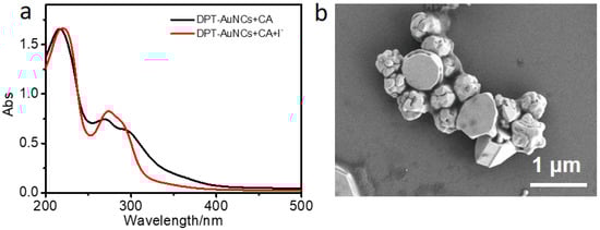 (a) UV-vis spectra of samples constituted by CA/DPT-AuNCs and CA/DPT-AuNCs/I−. (b) SEM image of CA/DPT-AuNCs/I−.