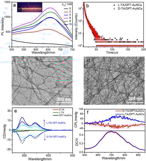 As shown in Figure 1a, chiral TA (D-TA) could also induce DPT-AuNC aggregates and improve the emission. Therefore, we explored the influence of different concentrations of D-TA on the intensity of DPT-AuNC emission. As shown in Figure 4a and Figure S11, PL intensity was improved with increasing cD-TA, and reached a peak at cD-TA = 6 mM (λem = 656 nm). With further increases in the cTA, a slight decrease in the PL intensity was observed. The increase in lifetime was coincident with the enhanced emission of the DPT-AuNCs. The average phosphorescence lifetime of D-TA/DPT-AuNCs is 4.72 μs (χ2 = 1.0195), obtained by integrating of 1.78 μs (60.57%) and 9.24 μs (39.43%). We also studied the co-assembly behavior of L-TA/DPT-AuNCs. The PL intensity reached a maximum with cL-TA = 6 mM with an average lifetime of 4.55 μs (1.79 μs (59.21%) and 8.55 μs (40.79%) χ2 = 1.0289) (Figure S12, Figure S13 and Figure 4b). TEM was utilized to examine the morphological structures of the co-assemblies. As shown in Figure 4c,d, the TA/DPT-AuNCs aggregated into ultralong nanofibers with a width of 29 ± 2 nm.