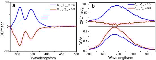 (a) CD spectra and (b) CPL spectra of L-TA/CA/DPT-AuNCs and D-TA/CA/DPT-AuNCs (cTA = 3 mM; cCA = 3 mM).
