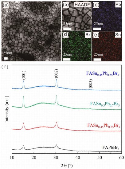 (a) TEM image of the FAPb0.7Sn0.3Br3 nanocrystal (b) High−angle dark field image of the FAPb0.7Sn0.3Br3 nanocrystal (c) Pb (d) Br, and (e) Sn element mapping results (f) XRD patterns of FAPb1-xSnxBr3 nanocrystalline films with different Pb/Sn ratios.