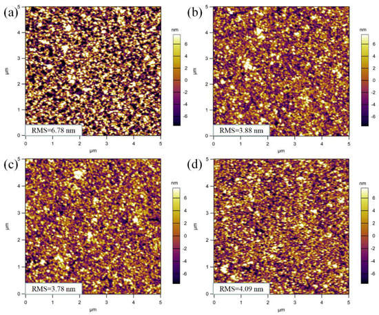 The surface morphology of perovskite NC films will affect the performance of PeLEDs, so atomic force microscopy (AFM) was used to directly observe the surface microstructure of the FAPb0.7Sn0.3Br3 NC films; the results are shown in Figure 3. As the number of droplets increased from one to four drops, the surface roughness of these films first decreased obviously and then slightly increased. AFM measurements showed that the root mean square (RMS) roughness of the FAPb0.7Sn0.3Br3 film decreased significantly from 6.78 nm to 3.78 nm with increasing droplet number from one to three drops. However, a further increase in the perovskite solution to four drops yielded a higher RMS roughness of 4.09 nm. The formation of a relative smooth and connected surface morphology for the film prepared from the 3-drop solution was due to the filling of the surface cavities. In contrast, the increase in RMS roughness for the film made from the 4-drop solution was due to a slight surface agglomeration of the FAPb0.7Sn0.3Br3 nanocrystals. Therefore, combining the results of surface roughness (shown in Figure 3c) and PL spectra (shown in Figure 2b), the optimal thickness of the light-emitting layer film was 41 nm, similar to the results obtained in [16,30].
