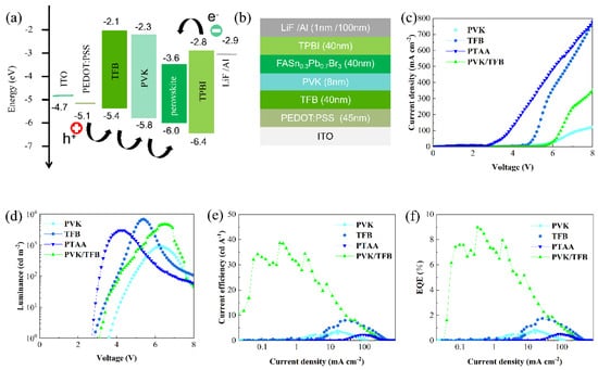 Compared with single hole transport devices, PeLED fabricated with the TFB/PVK double hole transport structure exhibited better electroluminescence performance due to the formation of a cascade-like level alignment, which facilitates hole transport (shown in Figure 5a) [9]. The TFB/PVK double HTLs were constructed by coating a layer of PVK (8 nm) film on the surface of the TFB film (40 m), and the film thickness of each layer was measured by a step meter. As illustrated in Figure 5e,f, the maximal EQE was found to be 9% in the TFB/PVK double HTL device with a current efficiency peak value of 38.6 cd A−1 and a turn-on voltage of 3.2 V (shown in Figure 5d), which was improved by approximately 10.9 and 5.14 times as compared to the single HTL PVK or TFB device, respectively. The formation of a cascaded energy band structure by inserting TFB (−5.4 eV) between PEDOT:PSS (−5.1 eV) and PVK (−5.8 eV) in the double HTL device might be the main reason for the significant improvement in the electroluminescent properties. Therefore, we demonstrate that the TFB/PVK double HTL structure is favorable for hole injection (shown in Figure 5a), which is an effective approach to improve the PeLED performance.