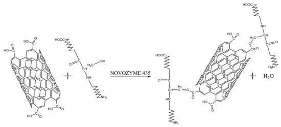 CNT functionalization was realized using an immobilized acrylic resin lipase of Candida antarctica (Novozyme 435, Sigma–Aldrich, St. Louis, MO, USA). Lipase can catalyze esterification between the carboxylic group present in the CNTs-COOH and a hydroxyl group present in some amino acids (Figure 1).