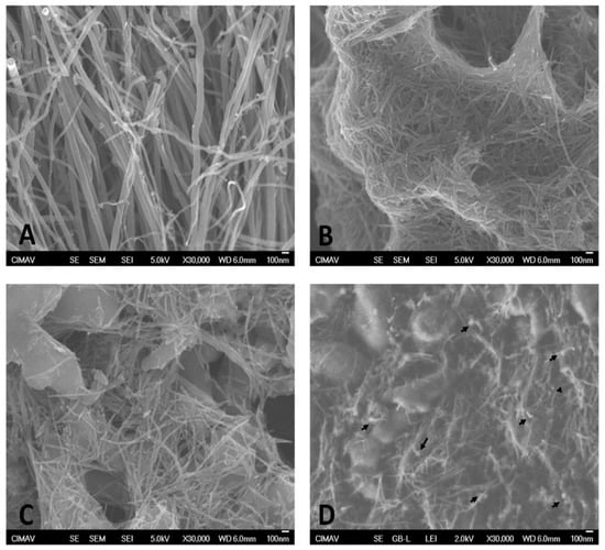 Microphotographs obtained by SEM. Microphotographs show the aspects of (A) pristine CNTs, (B) purified CNT-COOH, (C) CNT-INSp, and (D) CNT-INSs. Arrows indicate spherical bodies detected on the CNT surface.