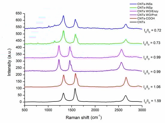Figure 3 displays the Raman spectra for each CNT, and the ratio between the intensities of the G and D bands (IG/ID) was calculated and included in the figure. The IG/ID ratio is related to the structural quality; pristine CNTs show the highest IG/ID ratio, followed by CNTs-COOH. Functionalization with insulin decreases the structural quality of the CNTs, reducing the IG/ID ratio to 0.72 since the added insulin disturbs the surface of the CNTs, and interactions of radical insulin groups with carbonyl or carboxyl groups on CNTs-COOH can also be implicated. Additionally, in the CNTs-INSs, a clear band at 1000 cm−1 was observed, which corresponds to the insulin spectra [28].