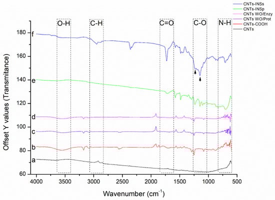 The FTIR spectra for the different CNTs are shown in Figure 4. Pristine CNTs show a characteristic baseline without peaks since the CNTs initially do not present any functional groups on their surface (Figure 4 (a), black line). After purification with acid treatment, peaks corresponding to the COOH group (C=O and O-H) and the C-C bond of the carboxyl group attached to the CNTs (Figure 4 (b), red line) were detected (also, see Supplementary Figure S1). On the other hand, for the CNT-INSs (Figure 4 (f), blue line), an intense peak corresponding to the C=O group was observed at 1733 cm−1, as well as two other signals corresponding to two C-O bonds, indicating an ester bond (COO-R; arrows); besides, the broadband between 3000 and 3500 cm−1 decreases significantly suggesting a reduction in free carboxylic groups and corroborate the bond between insulin and CNTs-COOH. Likewise, signals corresponding to CH3 and CH2 are observed (a region that is characteristic of amino acids) [29] in the CNTs-INSs, corresponding to the amino acids of insulin; these signals are absent in the CNTs-COOH and CNTs-INSp (Figure 4 (b,e), red and green line, respectively). The controls (Figure 4 (c,d), lines purple and pink, respectively) show a similar spectrum to CNTs-COOH (Figure 4 (b), red line).