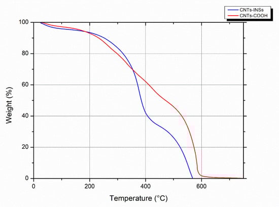 On the other hand, TGA of CNTs has become a relevant tool for purity analysis. The residual mass data provide information for the decomposition of the material. Most carbon-based materials are decomposed at 650 °C, and the residual mass is attributed to the metal catalyst particles that remain [30]. As shown in Figure 5, at 650 °C, the CNTs-COOH and CNT-INSs have no residual mass at this temperature, indicating very low or nonmetal catalysis particles resulting from a good purification process.