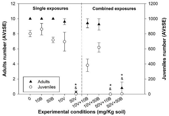 Effects on Enchytraeus crypticus survival (adult number) and reproduction (juvenile number) after 28 days exposure to: 0—control and solvent control; 10B—10 mg BNPs/kg soil; 50B—50 mg BNPs/kg soil; 10V—10 mg VNPs/kg soil; 50V—50 mg VNPs/kg soil; 10V + 10B—10 mg VNPs + 10 mg BNPs/kg soil; 10V + 50B—10 mg VNPs + 50 mg BNPs/kg soil; 50V + 10B—50 mg VNPs + 10 mg BNPs/kg soil; 50V + 50B—50 mg VNPs + 50 mg BNPs/kg soil, in LUFA 2.2 soil. Results are expressed as average value (AV) ± standard error (SE) (n = 4). *—Significant differences in the number of adults compared to control (p < 0.05); &—Significant differences in the number of juveniles compared to control (p < 0.05).