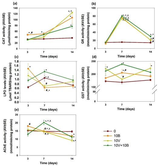 Effects on (a) catalase (CAT), (b) glutathione reductase (GR), (c) lipid peroxidation (LPO) levels, (d) glutathione-s-transferase (GST) and (e) acetylcholinesterase (AChE) activities of Enchytraeus crypticus exposed during 3, 7 and 14 days to: 0—control and solvent control; 10B—10 mg BNPs/kg soil; 10V—10 mg VNPs/kg soil; 10V + 10B—10 mg VNPs + 10 mg BNPs/kg soil, in LUFA 2.2 soil. Results are expressed as average values (AV) ± standard errors (SE) (n = 5). Significant differences (p < 0.05) relative to: (*) control group; (#) 10V + 10B; (+) day 3; (x) day 14.