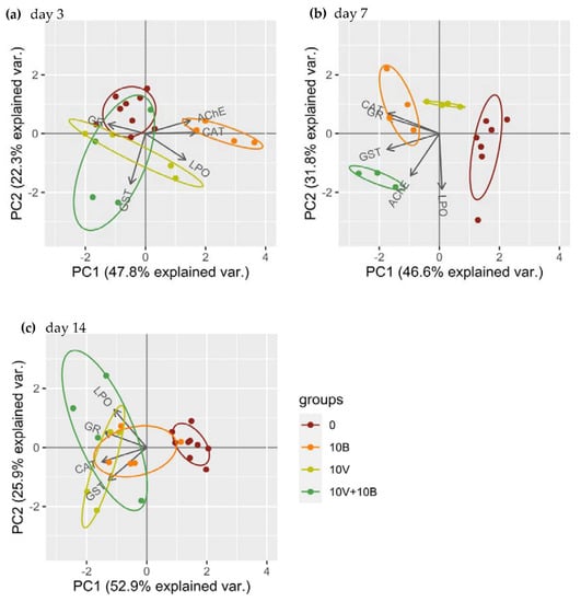 Together, the first two components (PC1 and PC2) account for 70.1, 78.4 and 76.7% of biochemical data variability at days 3, 7 and 14, respectively (Table S2). The score plots present distinct response patterns for the control (0), VNPs (10V) and BNPs (10B) at all times. The responses in the combination VNPs + BNPs (10V + 10B) group are dispersed at day 3 and 14 (Figure 3). At day 3, CAT is positively correlated with AChE (<90° angle) and negatively with GR (angle of approximately 180°), while GST has no/low correlation with the other variables. BNPs are mainly associated with AChE and CAT variables (Figure 3a). At day 7, CAT is highly correlated with GR while the other variable presents a low level of correlation. BNPs are mainly associated with CAT and GR variables while 10V + 10B is mainly associated with AChE and GST (Figure 3b). At day 14, CAT is positively correlated with GST and negatively with AChE, while LPO is positively correlated with GR. The control is mainly associated with AChE variable (Figure 3c).