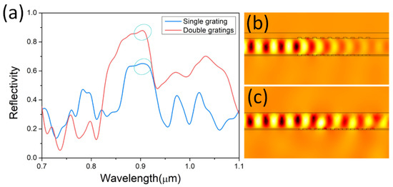 With similar refractive index contrast, a single grating can also provide high reflection and act as a reflector, which was elaborated on in our previous work [24]. To compare the reflective properties between double gratings and a single grating, reflective spectra are numerically calculated and demonstrated in Figure 3. With the same grating period, teeth height and number of the grating period, the reflection of double gratings is much stronger than that of a single grating. The reflectivity of the double gratings is as high as 88.7%, while the reflectivity of the single grating is only 65.3%. As in the profiles of Hz of the propagating mode shown in Figure 3b,c, the waveguiding mode interacts more strongly with the double gratings than the single grating. Most of electromagnetic energy is reflected by the double gratings, rather than leaking out of the nanowire.
