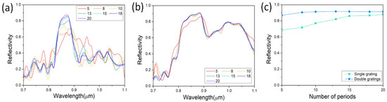 Reflective properties of gratings dependent on number of periods. Reflective spectra of various number of periods for nanowire (a) on single grating and (b) sandwiched in double gratings. (c) Comparison of reflectivity between nanowire on single grating and sandwiched in double gratings.