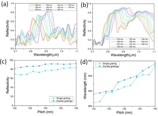 Reflective properties of gratings dependent on pitch. Reflective spectra of various pitch for nanowire (a) on single grating and (b) sandwiched in double gratings. Comparison of (c) reflectivity and (d) central reflective wavelength between nanowire on single grating and sandwiched in double gratings.