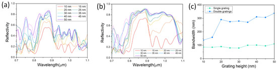 Similar to the number of the grating period, the height of the grating teeth also impacts on the reflection intensity of the grating. As depicted in Figure 6, both the reflectivity of the double gratings and the single grating increases with the increase of teeth height from 10 to 50 nm. They both have the smallest reflectivity at a teeth height of 10 nm. For the single grating, the reflectivity grows faster with increasing teeth height, while, for the double gratings, the reflectivity changes little for all teeth heights except for 10 and 15 nm. When the teeth height is small, the interaction between the guiding mode and the metal grating is weak. The weaker interaction with the decreasing teeth height results in the weaker reflection. In addition, the bandwidth of the reflective spectrum for the double gratings increases with the increasing height of grating teeth, covering more gain spectra of different compositions of compound semiconductor materials. The bandwidth is defined as the FWHM, i.e., full width at half maximum. Due to the disturbance of multiple peaks, the bandwidth can only be estimated to demonstrate the varying trend. It is necessary to note that simulation results may not be very precise at a teeth height of 10 nm for the limitation of the classic Drude model and its extensions of the adopted Drude–Lorentz model at about 10 nm [29]. The reflective spectrum for teeth height of 10 nm here is only for demonstrating the varying trend and making comparisons.