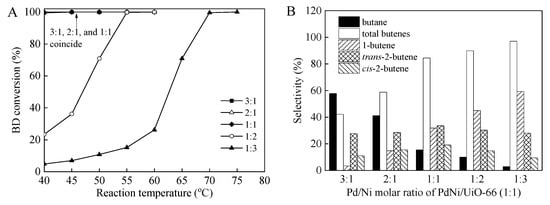 The molar ratio of the bimetallic metals presented a remarkable effect on the catalytic activity and selectivity in the hydrogenation of BD, because it affects the surface composition of bimetallic supported catalysts [1,15]. The effects of the Pd/Ni molar ratio of the PdNi/UiO-66 and PdNi/UiO-66-NH2 catalysts on the BD conversions and product selectivities for the BD hydrogenation were investigated (Figure 5 and Figure 6). For all the catalysts, the BD conversions and selectivities were found to be dependent on the molar ratio of Pd to Ni. The PdNi/UiO-66 catalyst with Pd/Ni ratios of 1:1, 2:1, and 3:1 displayed excellent BD conversions, reaching 99.8%, 100%, and 99.5% at 40 °C for the PdNi/UiO-66 (1:1), PdNi/UiO-66 (2:1), and PdNi/UiO-66 (3:1), respectively (Figure 5A). The BD conversions of PdNi/UiO-66 (1:3) and PdNi/UiO-66 (1:2) gradually increased with the increase in temperature; they were 99.6% and 99.8% at 70 °C and 55 °C for PdNi/UiO-66 (1:3) and PdNi/UiO-66 (1:2), respectively (Figure 5A). The selectivities of total produced butenes increased from 42.2% to 97.1% as the Pd/Ni molar ratio decreased from 3:1 to 1:3 at nearly 100% BD conversion (Figure 5B). Among all the tested PdNi/UiO-66 with different molar ratios, PdNi/UiO-66 (1:1) displays the highest catalytic activity and butene selectivity toward BD hydrogenation. For PdNi/UiO-66-NH2, the catalytic activity (BD conversion) enhanced with the raise in the Pd/Ni molar ratio. PdNi/UiO-66-NH2 (3:1) displayed the highest catalytic activity. A nearly complete BD conversion (99.7%) was achieved at 40 °C (Figure 6A). BD conversions of 98.4%, 95.1%, 100%, and 97.7% were achieved on PdNi/UiO-66-NH2 (1:3), PdNi/UiO-66-NH2 (1:2), PdNi/UiO-66-NH2 (1:1), and PdNi/UiO-66-NH2 (2:1) at 100 °C, 90 °C, 60 °C, and 55 °C, respectively (Figure 6A). The selectivities of total butenes were 87.7%, 80.8%, 89.5%, 72.8%, and 86.5% at nearly 100% BD conversion on PdNi/UiO-66-NH2 (1:3), PdNi/UiO-66-NH2 (1:2), PdNi/UiO-66-NH2 (1:1), PdNi/UiO-66-NH2 (2:1), and PdNi/UiO-66-NH2 (3:1), respectively (Figure 6B). Although the PdNi/UiO-66-NH2 (1:1) catalyst displayed moderate catalytic activity, the excellent butene selectivity displayed that the PdNi/UiO-66-NH2 catalyst with a Pd/Ni molar ratio of 1:1 rendered its optimal proportion.
