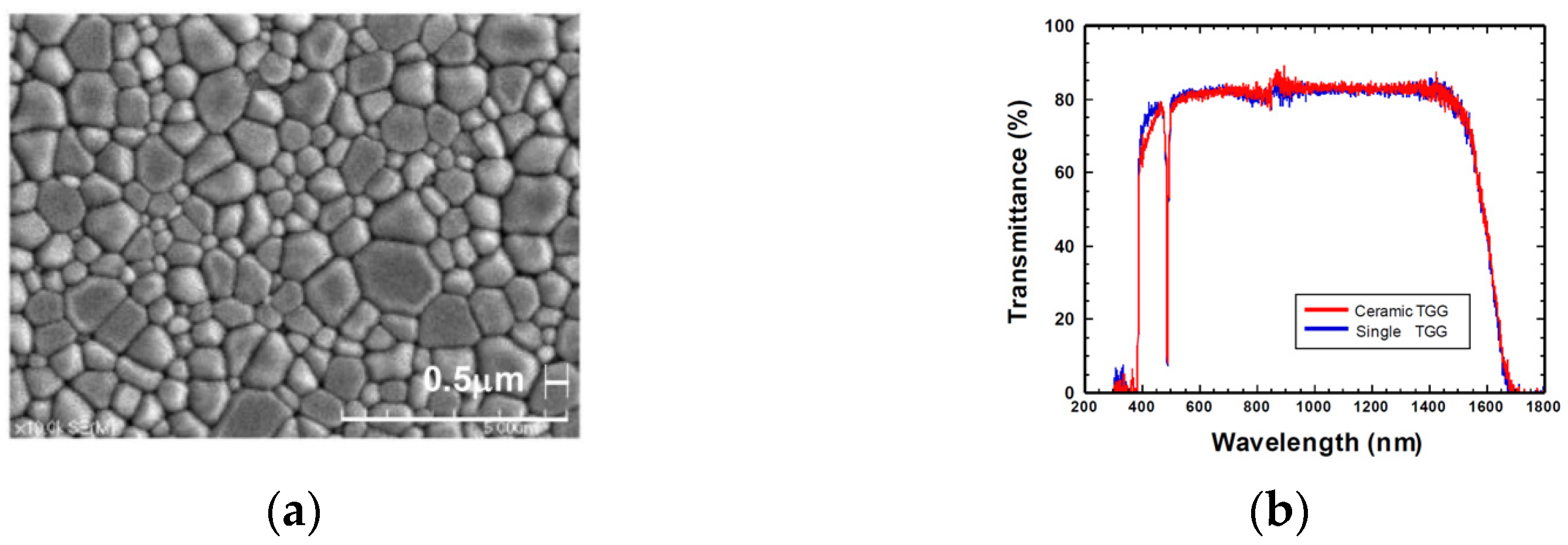 - Jin, W.; Gai, L.; Chen, J.; Lin, H.; Li, C.; Su, L.; Wu, A.; Zeng, F. Fabrication and magneto-optical properties of TGG transparent ceramics. Phys. B 2019, 555, 96–98. [Google Scholar] [CrossRef]
