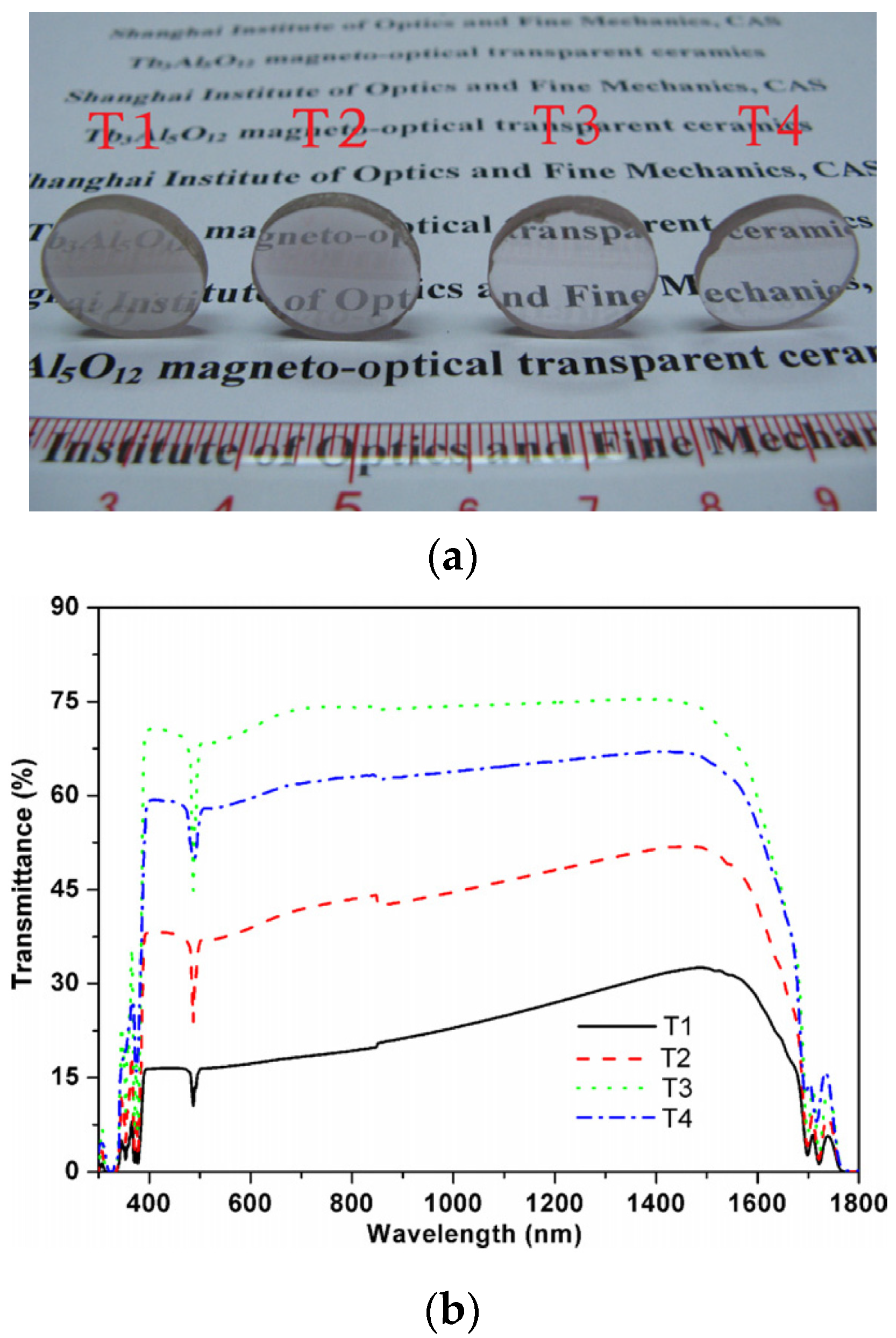 - Li, X.; Snetkov, I.; Yakovlev, A.; Liu, Q.; Liu, X.; Liu, Z.; Chen, P.; Zhu, D.; Wu, L.; Yang, Z.; et al. Fabrication and performance evaluation of novel transparent ceramics RE:Tb3Ga5O12 (RE = Pr, Tm, Dy) toward magneto-optical application. J. Adv. Ceram. 2021, 10, 271–278. [Google Scholar] [CrossRef]