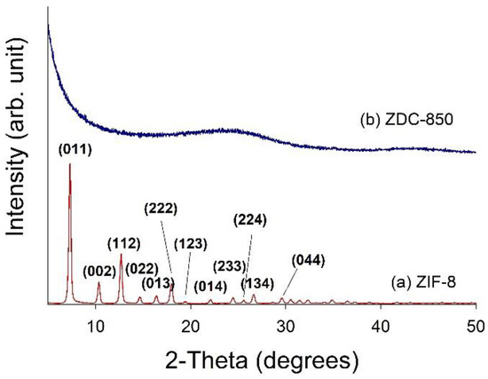 The XRD patterns of ZIF-8 and ZDC-850 are shown in Figure 2. The typical characteristic peaks at 2θ of 7.3, 10.4, 12.7, 14.6, 16.4, 18.0, 19.5, 22.1, 24.5, 25.6, 26.6, and 29.6° are ascribed to the (011), (002), (112), (022), (013), (222), (123), (114), (233), (224), (134), and (044) planes of ZIF-8 (CCDC 602542, [41]), respectively. However, the framework decomposition was observed in the XRD pattern of ZDC-850, where only one detectable peak was observed at approximately 2θ = 26°, belonging to a typical (002) interlayer peak of graphite-type carbons. The XRD results were consistent with the FESEM images.